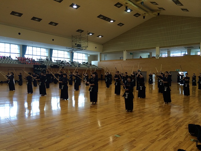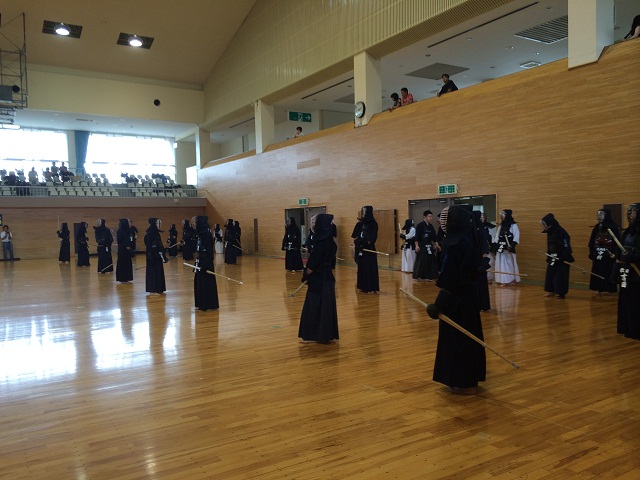 午前中は休憩にあて、14:00から1回目の稽古を開始しましたが、初回にも関わらず沢 山の地元の先生方が参加され25名を数え、中高生も40名程度参加したことからいきな り100名近い人数で稽古でした。
